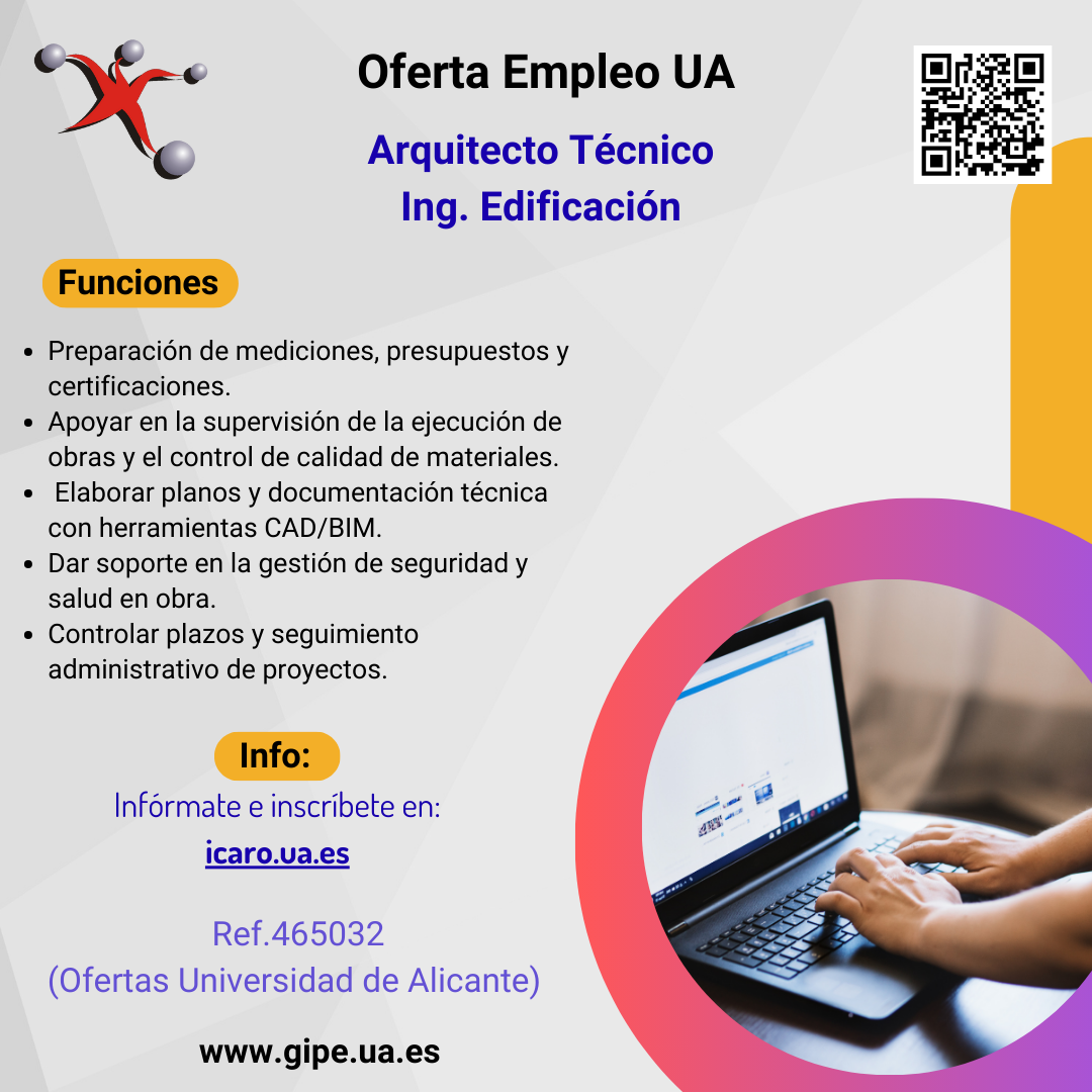 Funciones: Preparación de mediciones, presupuestos y certificaciones. Apoyar en la supervisión de la ejecución de obras y el control de calidad de materiales. Elaborar planos y documentación técnica con herramientas CAD/BIM. Dar soporte en la gestión de seguridad y salud en obra. Controlar plazos y seguimiento administrativo de proyectos.