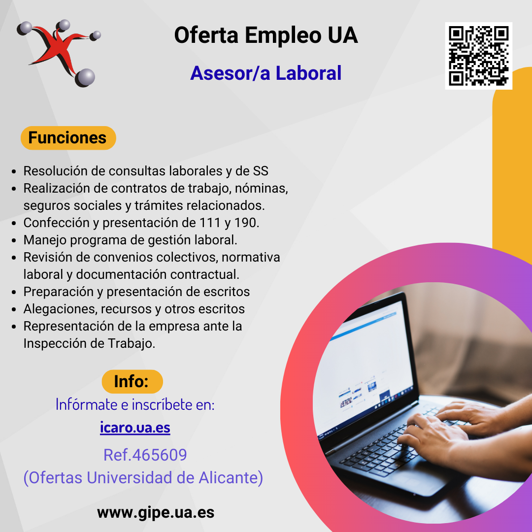 Funciones: -Resolución de consultas laborales y de seguridad social planteadas por los clientes. -Realización de contratos de trabajo, nóminas, seguros sociales y trámites relacionados. -Confección y presentación de los modelos 111 y 190. -Manejo de nuestro programa de gestión laboral. -Revisión de convenios colectivos, normativa laboral y documentación contractual. -Preparación y presentación de escritos, prestaciones, liquidaciones y otros documentos ante organismos oficiales (TGSS, SEPE, INSS, etc.). -Estudio y preparación de alegaciones, recursos y otros escritos dirigidos a la administración laboral. -Representación de la empresa ante la Inspección de Trabajo.