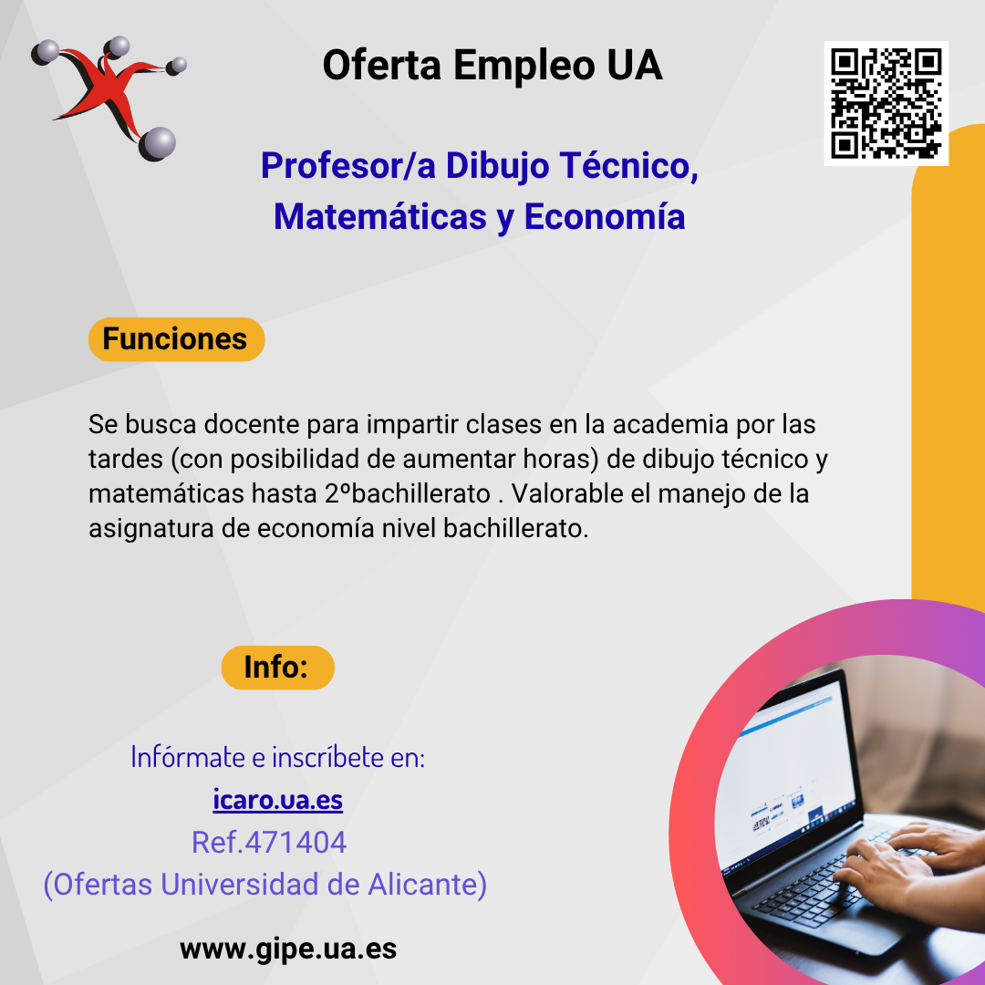 Funciones: Se busca docente para impartir clases en la academia por las tardes (con posibilidad de aumentar horas) de dibujo técnico y matemáticas hasta 2ºbachillerato . Valoráble el manejo de la asignatura de economía nivel bachillerato.