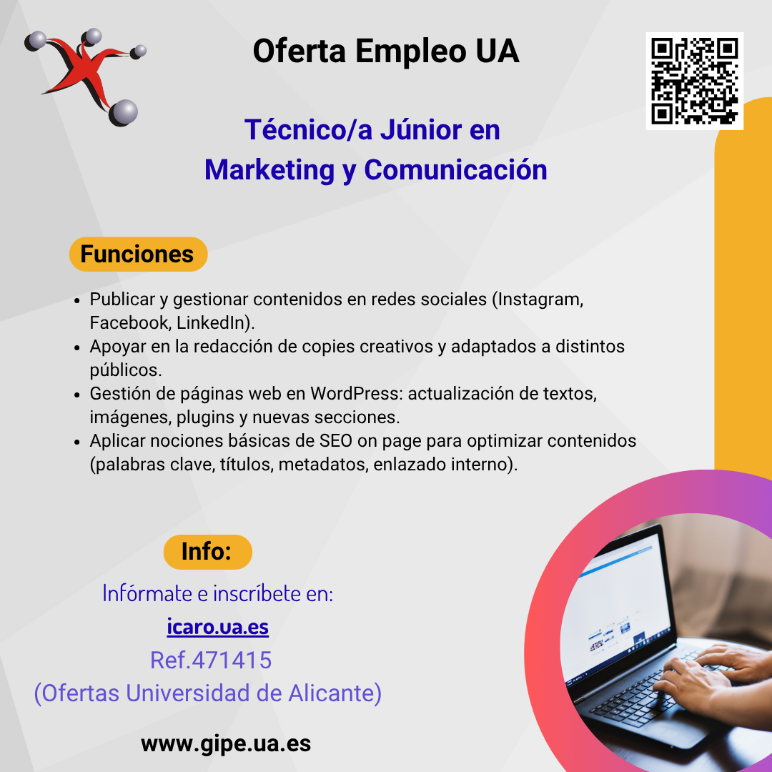 Funciones: Publicar y gestionar contenidos en redes sociales (Instagram, Facebook, LinkedIn). Apoyar en la redacción de copies creativos y adaptados a distintos públicos. Gestión de páginas web en WordPress: actualización de textos, imágenes, plugins y nuevas secciones. Aplicar nociones básicas de SEO on page para optimizar contenidos (palabras clave, títulos, metadatos, enlazado interno).